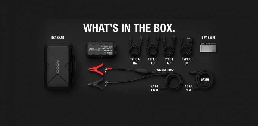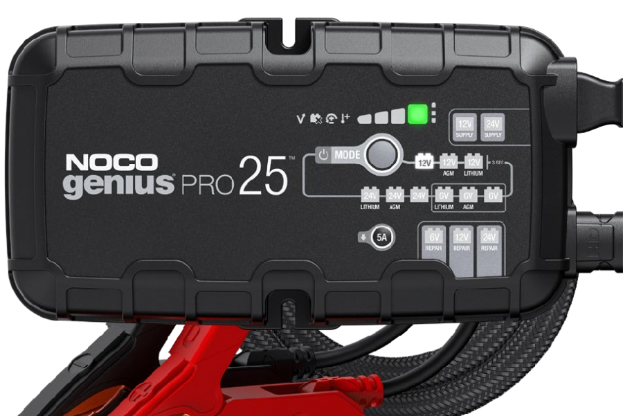 Przedstawiamy zupełnie nowy GENIUSPRO25, w pełni automatyczną, profesjonalną inteligentną ładowarkę 6 V, 12 V i 24 V, konserwator, zasilacz i z funkcją odsiarczania akumulatorów z kompensacją temperatury na poziomie 25 amperów dla wszystkich typów samochodów, akumulatorów morskich i cyklicznych do głębokiego rozładowania.