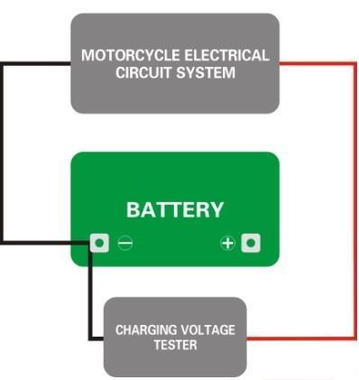 Krok 3. Odłączyć zacisk akumulatora od dodatniego przewodu motocykla. Woltomierz następnie ukaże wyjściowe napięcie ładowania motocykla. Nastawić obroty motocykla na 2000 obrotów i 5000 obrotów oraz skontrolować napięcie ładowania. Wartość napięcia ładowania jest prawidłowa w przypadku, gdy znajduje się ona między 14,0-15,0 V. Akumulator można używać - będzie normalnie pracować. Akumulator nie może zostać w pełni naładowany w przypadku, gdy napięcie ładowania jest niższe niż 14,0 V. W przypadku, gdy napięcie ładowania jest wyższe niż 15,0 V, zostanie przeładowany. Oba wspomniane stany w określonym stopniu przyczyniają się do uszkodzenia akumulatora, dlatego system ładowania motocykla przed instalacją akumulatora winien zostać wyregulowany lub naprawiony.
